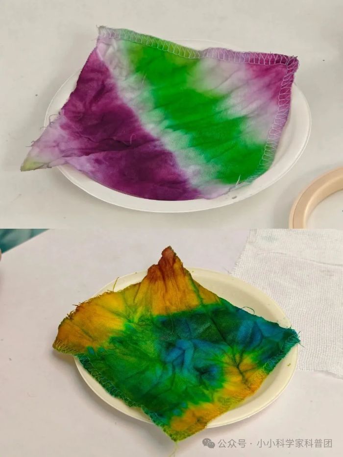 染色實驗環節,孩子們了解到鹽作為固色劑的妙用,過程中看著布料在染液中慢慢變色,孩子們滿心期待,感受纖維吸色的奇妙,人工造紙環節,孩子們將衛生紙泡軟揉成紙漿,倒在濾網上鋪平、壓干,散開的纖維便重新粘合成一張新紙。孩子們看著自己親手造出的紙,臉上滿是成就感。