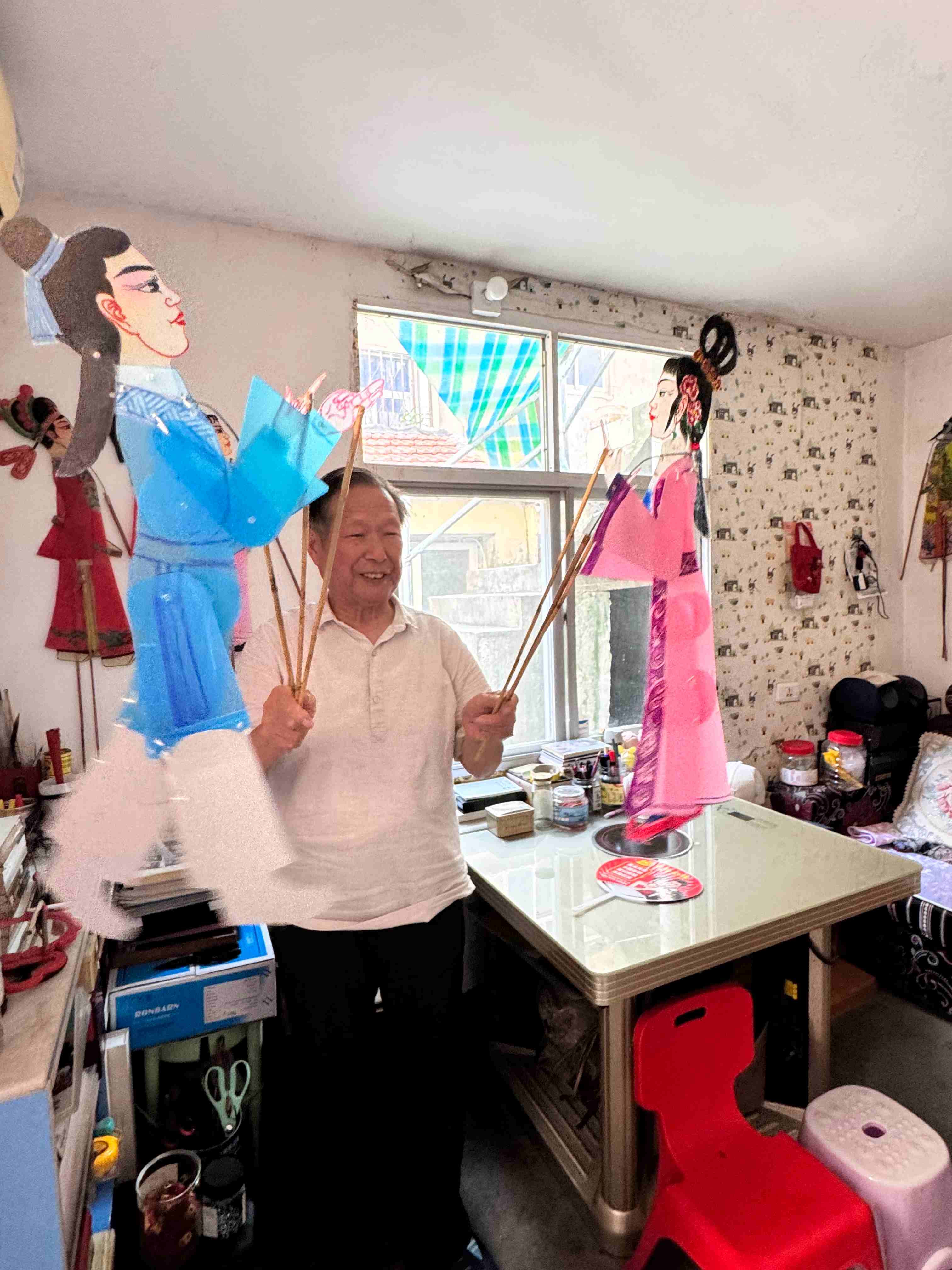 團(tuán)隊(duì)成員們與滕德清先生進(jìn)行訪談 劉彥希攝滕德清的話語(yǔ)里,藏著從“謀生”到“生命”的蛻變。六十年間,他見過(guò)太多同行,徒弟因生計(jì)而放棄,也經(jīng)歷過(guò)戲團(tuán)發(fā)不出工資的窘迫,但他始終沒有放下刻刀與桿杖。這種堅(jiān)守,早已超越了對(duì)物質(zhì)的需求——當(dāng)一項(xiàng)技藝融入日常的呼吸,當(dāng)皮影人的一舉一動(dòng)與自己的喜怒哀樂相連,職業(yè)便升華為使命,對(duì)這項(xiàng)技藝的熱愛逐漸成為生命中不可分割的部分。