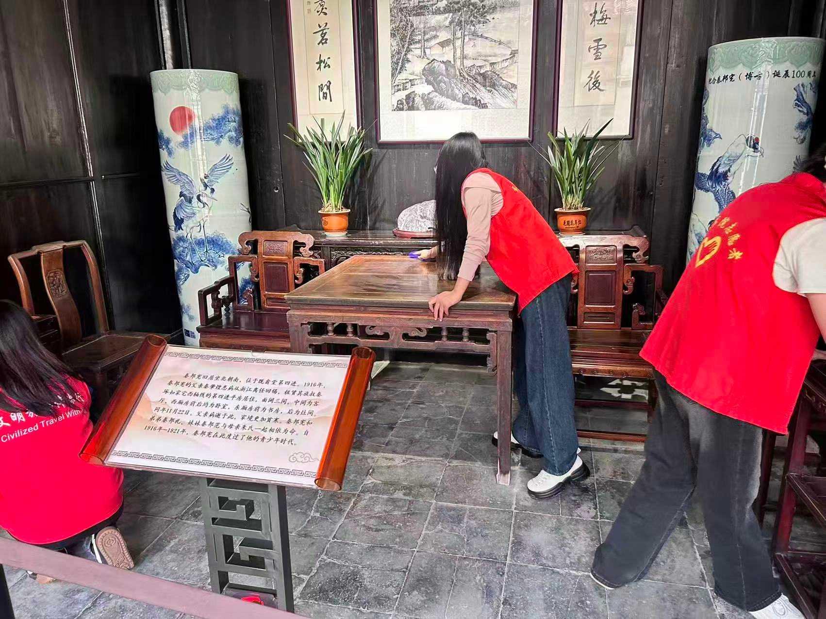 為了讓故居以更整潔的面貌迎接參觀者,團隊成員主動加入到打掃衛生的行列中。大家分工合作,有的擦拭展柜上的灰塵,確保每一件展品都清晰呈現;有的清掃庭院里的落葉,讓紅色陣地始終保持莊重整潔;有的整理參觀者留下的資料,維護故居的良好秩序。在勞動過程中,隊員們切身感受到守護紅色遺產的責任,每一次擦拭、每一次清掃,都是與歷史的對話,更是對革命先輩的緬懷。