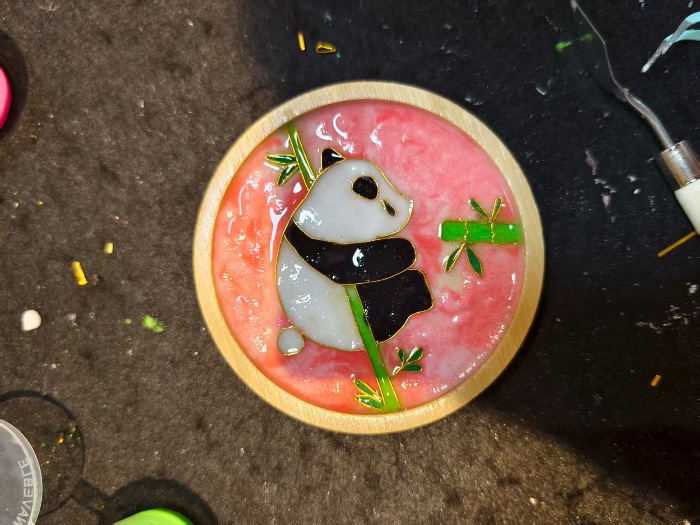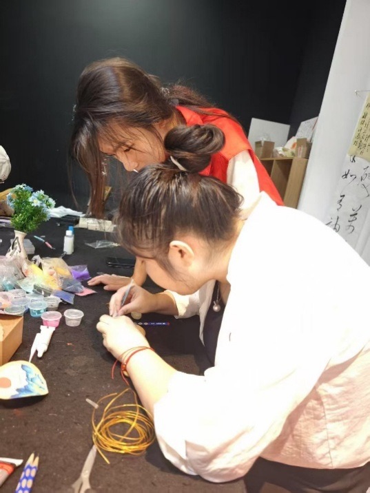 完成掐絲后,就進入了填色環節,這也就是點藍工藝。這是整個制作過程中最具創意和樂趣的部分,同時也是最考驗細心程度的環節。老師為大家展示了如何調配顏料,如何用細小的畫筆將顏料均勻地填充到金屬絲勾勒出的區域內。五彩斑斕的琺瑯釉料在大家的筆下,慢慢填充進銅絲框架,原本單調的圖案逐漸變得生動起來。實踐團成員王同學選擇了鮮艷的色彩來填充自己的作品,“我希望我的作品能夠色彩鮮艷,充滿活力。”她一邊填色一邊說道。