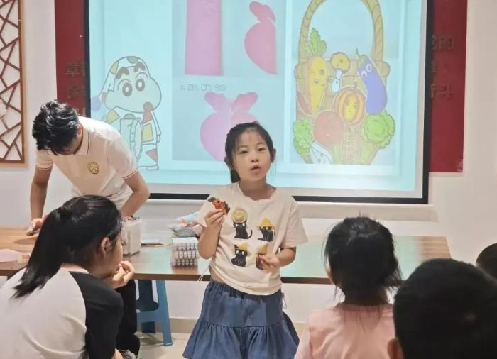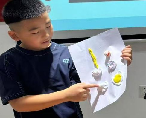 在活動中,志愿者圍繞健康飲食主題,分階段開展了早餐、午餐、晚餐系列教學(xué):通過圖文PPT為孩子們講解三餐的定義、歷史演變、文化傳統(tǒng)、營養(yǎng)價值及科學(xué)搭配原則,幫助建立健康飲食基礎(chǔ)認(rèn)知;互動環(huán)節(jié)借助趣味小游戲讓孩子們在輕松氛圍中理解三餐重要性,同時選取《肚子里有個火車站》《漢堡男孩》《我不挑食》等經(jīng)典繪本,將“細(xì)嚼慢咽、不挑食、均衡飲食”等科學(xué)理念融入故事講述,引發(fā)熱烈討論;手工與藝術(shù)創(chuàng)作環(huán)節(jié)中,孩子們動手制作三明治、牛奶等黏土模型,在紙扇上描繪喜愛的水果蔬菜,在實(shí)踐中深化了對合理膳食和健康飲食的理解。