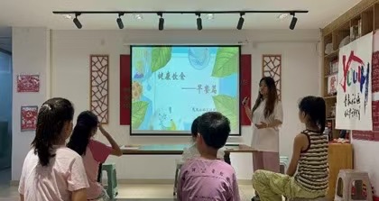 在上午,志愿者們通過圖文并茂的PPT,圍繞“早餐”這一主題,為小朋友們生動講解著早餐的定義與歷史以及早餐的價值,助力孩子們對健康飲食形成基礎認識。講解過程中,孩子們認真聽講,并積極舉手互動提問,在歡快的交流與學習里,慢慢懂得如何健康飲食。