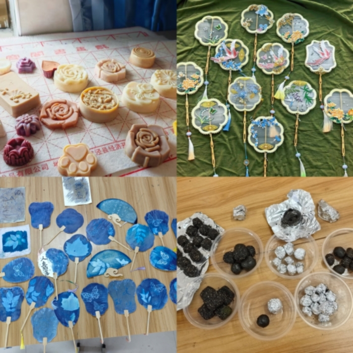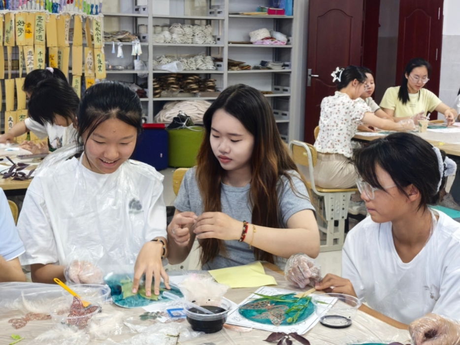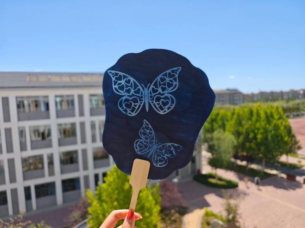 光影與化學的魔法在藍曬工藝中上演。涂布感光液的卡紙如同等待書寫的藍色詩篇。孩子們精心排列蠶繭、桑葉,輔以象征信仰的紅色剪紙元素。陽光成為最神奇的畫師,曝曬、流水沖洗后,普魯士藍的深邃背景上,蠶桑的印記與紅色的信仰交相輝映,凝結成獨一無二的光影藝術。孩子們展示藍圖,講述的不僅是構圖巧思,更是對“經緯交織,團結奮斗”的生動理解。