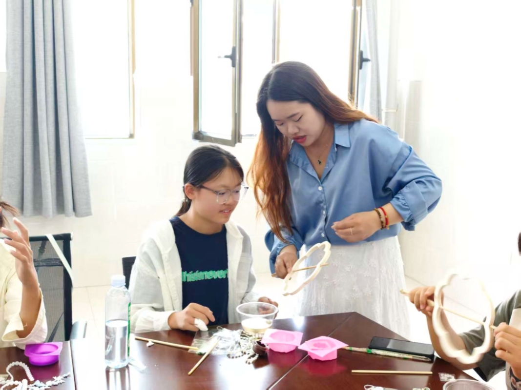 震撼之后是專注的匠心傳遞。煮繭盆熱氣蒸騰,尋找絲頭需要無比的耐心與敏銳。在江蘇科技大學生物技術學院研究生第二黨支部成員吳伊湘的指導下,素凈的團扇骨架漸漸被晶瑩剔透的蠶絲溫柔纏繞。絲韻流轉間,小小蠶絲扇,承載著凌云壯志與赤誠童心,在夏日晚風中輕輕飄揚。