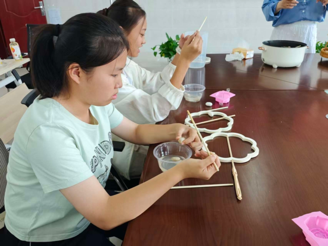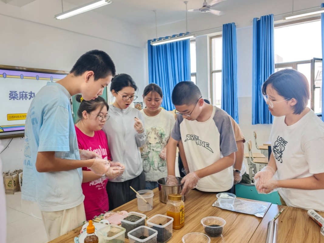 舌尖共繡:桑麻凝萃與赤幟同心 收官之日,蠶桑文化從指尖延伸到味蕾,生物技術學院聞燕副教授引領孩子們探索桑葉入饌的悠久歷史與現代養生價值。親手揉捏桑麻丸的過程,是知識在勞動中內化的甜蜜體驗。