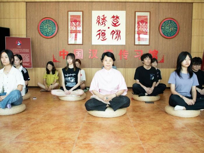 半小時內(nèi),靜室中唯有均勻呼吸聲。課后有隊員坦言,起初滿腦子都是繡團扇的失誤,糾結(jié)“下一針怎么繡”,但隨著呼吸平穩(wěn),雜念消散,肩膀緊繃感褪去,心也漸漸沉靜。睜眼時,不少人露出“從未有過的放松”神情。王子怡老師解釋:“漢繡講究‘心手合一’,打坐能磨性子、穩(wěn)心神,這股靜氣正是穿針引線的關(guān)鍵。”