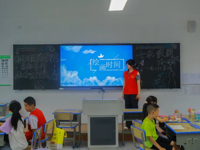而繪畫課堂則是創意與想象的天地。實踐隊隊員站在講臺上,通過大屏幕展示繪畫的奇妙世界,引導孩子們拿起畫筆,描繪心中的美好圖景。孩子們專注地用手中的彩筆,勾勒線條、涂抹色彩,將對生活的熱愛、對未來的憧憬呈現在畫紙上。從多彩的校園風景到夢幻的童話世界,每一幅畫作都飽含著童真與幻想。