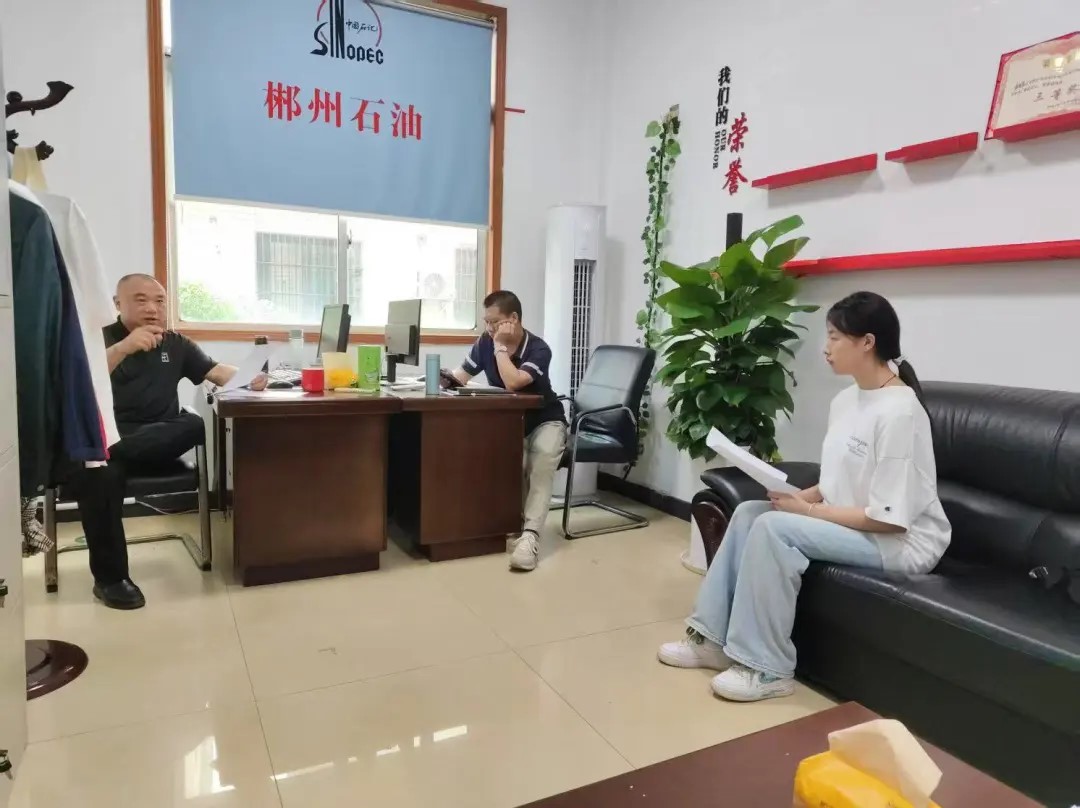 圖為“綠色轉(zhuǎn)型調(diào)研隊(duì)”成員采訪中國石化郴州分公司管理人員。周奕婕 供圖