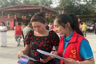 圖為圖木舒克市44團2連、3連居民在通過閱讀反詐宣傳彩頁和聽實踐隊員講解中認真學習反詐知識。柴美景 供圖