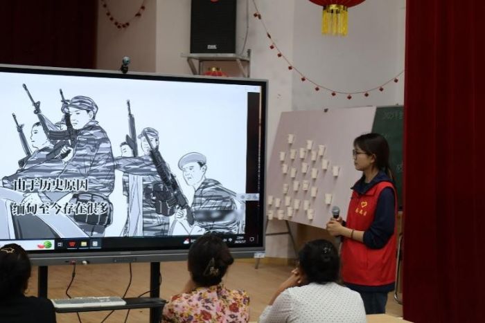 此圖為實踐團隊員向居民就宣傳冊上的新型詐騙手段進行講解。曹渭荻供圖