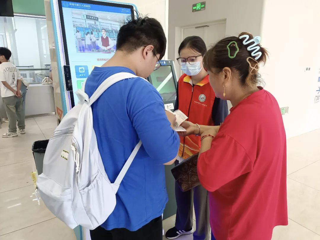 “阿姨,您把門診卡插到這里,我?guī)湍鷴焯枴?rdquo;“爺爺,醫(yī)學影像科在3樓,我?guī)^去!”……志愿者們耐心地為老年患者講解自助掛號機的使用方法,協(xié)助他們完成掛號、繳費、打印報告等操作;對于行動不便或方向感欠佳的患者,志愿者們主動上前攙扶、引導,確保他們順利抵達診室。此外,志愿者們還協(xié)助醫(yī)護人員維持候診秩序,緩解了就診高峰期的壓力。