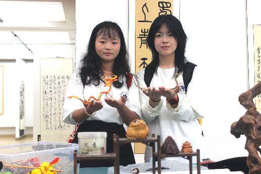圖為團隊成員在劍閣縣文化館美術館體驗劍閣縣非遺棕編技藝。