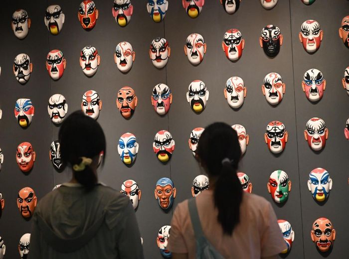 隊員趙靖雯和韋晨曦在欣賞臉譜墻。李金麒供圖