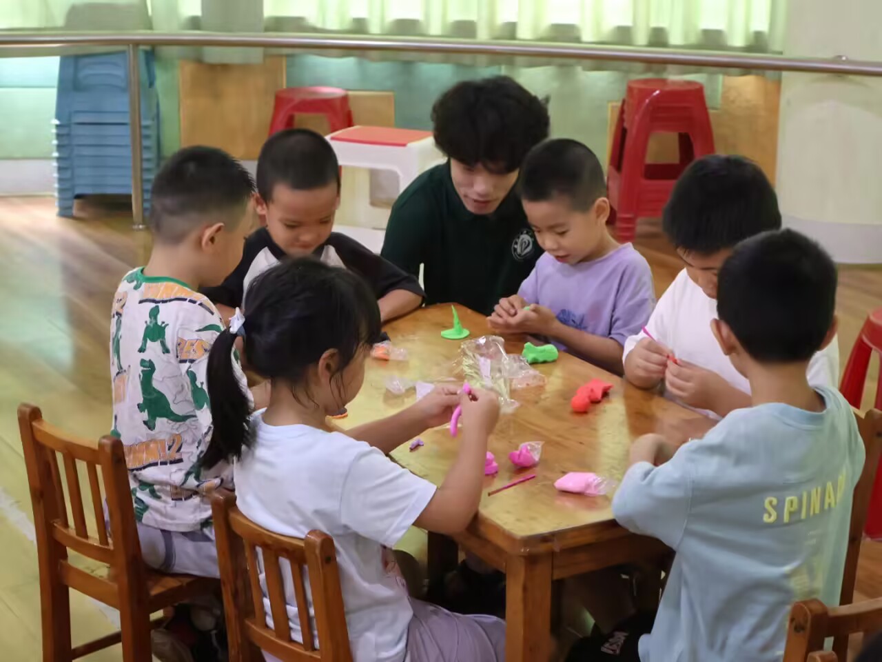 活動中,孩子們圍繞“我心中的家鄉(xiāng)”主題,用五顏六色的粘土盡情創(chuàng)作。有的捏出家鄉(xiāng)標志性的建筑,有的塑造出家鄉(xiāng)的特色美食,還有的還原了家鄉(xiāng)的美麗山水。實踐隊志愿者們分組進行指導,耐心教授孩子們?nèi)、搓、捏、粘等基本造型技巧,幫助他們將腦海中的家鄉(xiāng)模樣轉(zhuǎn)化為生動的粘土作品。在創(chuàng)作過程中,孩子們相互交流想法,分享創(chuàng)作靈感,遇到難題時齊心協(xié)力解決,展現(xiàn)出的團隊合作精神十分動人。一件件充滿童真與想象力的粘土作品相繼誕生,每一件都凝聚著孩子們對家鄉(xiāng)的真摯情感與獨特理解。
