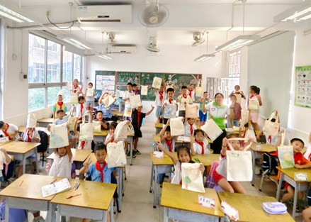 該團隊講師通過“每2秒就有動物因塑料而死”的實例,把抽象的環保概念變成孩子們能理解的具體認知。隨后,還科普了一些在日常中可以減少浪費的方法,并引導他們在布袋上自由繪畫,讓想象力為環保增添色彩。