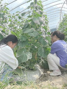 清晨五點,天邊剛泛起魚肚白,瓜果園里的實踐隊員們已經(jīng)開始了一天的勞作。他們穿著防曬衣,戴著草帽,穿梭在黃瓜藤和番茄架之間,仔細地檢查每一株作物的生長情況。