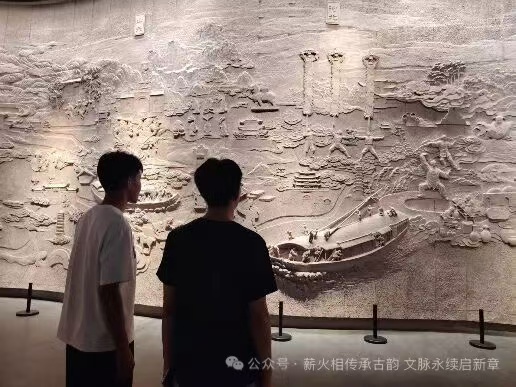 第二站團(tuán)隊(duì)前往滄州,在滄州市大運(yùn)河博物館開展實(shí)踐。這座以“運(yùn)河文化”為核心的場(chǎng)館,通過“千年運(yùn)河”“漕運(yùn)記憶”“精神傳承”三大展區(qū),運(yùn)用文物陳列、多媒體互動(dòng)、場(chǎng)景復(fù)原等技術(shù),全方位呈現(xiàn)大運(yùn)河的歷史脈絡(luò)與文化價(jià)值。團(tuán)隊(duì)首先在“千年運(yùn)河”展區(qū)參觀,近距離觀察唐代船型陶俑、宋代運(yùn)河磚、明清漕運(yùn)賬簿、民國(guó)沿岸商號(hào)印章等200余件文物,通過文物年代、用途的梳理,繪制出“大運(yùn)河漕運(yùn)發(fā)展時(shí)間軸”,清晰掌握不同朝代運(yùn)河的功能演變——從唐代的軍事運(yùn)輸為主,到宋代的南北物資交流核心,再到明清時(shí)期成為“國(guó)家經(jīng)濟(jì)生命線”的轉(zhuǎn)變過程。在“漕運(yùn)記憶”展區(qū),團(tuán)隊(duì)體驗(yàn)了多媒體互動(dòng)項(xiàng)目“漕運(yùn)船員的一天”,通過模擬駕駛漕船、裝卸貨物、與沿岸商戶交易等場(chǎng)景,直觀感受古代漕運(yùn)人員的工作艱辛與智慧,有成員在體驗(yàn)后表示“以前只知道運(yùn)河是‘黃金水道’,卻不知道船員要應(yīng)對(duì)水情變化、貨物管理、多方協(xié)調(diào)等多重挑戰(zhàn),這讓我對(duì)‘工匠精神’有了更具體的理解”。隨后,在“精神傳承”展區(qū),團(tuán)隊(duì)結(jié)合展區(qū)對(duì)運(yùn)河橋梁建造技藝、漕運(yùn)商號(hào)經(jīng)營(yíng)理念、沿岸民俗融合的展示,分組提煉大運(yùn)河所蘊(yùn)含的文化精神:工程組聚焦工匠們?yōu)榻鉀Q運(yùn)河水位差問題而發(fā)明的“水閘技術(shù)”,總結(jié)出“精益求精、攻堅(jiān)克難”的工匠精神;商貿(mào)組通過分析漕運(yùn)商號(hào)“誠(chéng)信經(jīng)營(yíng)、跨區(qū)域合作”的案例,提煉出“開拓進(jìn)取、互利共贏”的發(fā)展勇氣;文化組則從運(yùn)河沿岸戲曲、飲食、節(jié)慶的融合現(xiàn)象,歸納出“開放包容、多元共生”的文化胸懷。參觀結(jié)束后每位成員結(jié)合自身參觀重點(diǎn)與感悟發(fā)言,進(jìn)一步深化對(duì)運(yùn)河文化精神的認(rèn)知。