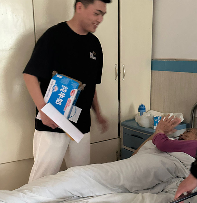 在這之后青年志愿者與護工人員共同完成了午餐,在此期間護工人員也講述了養老院的現狀,院中的老人們或多家屬因工作繁忙、異地居住,無充足時間和精力陪伴照護,也有部分老人為減輕子女照護壓力,主動提出入住,不愿成為家庭負擔,相對于物質生活他們需要是更多的是親人的關心,以至于志愿者的每一次到來老人們都滿懷熱情,對于老人來說志愿者的到來更像是對于親情的寄托。