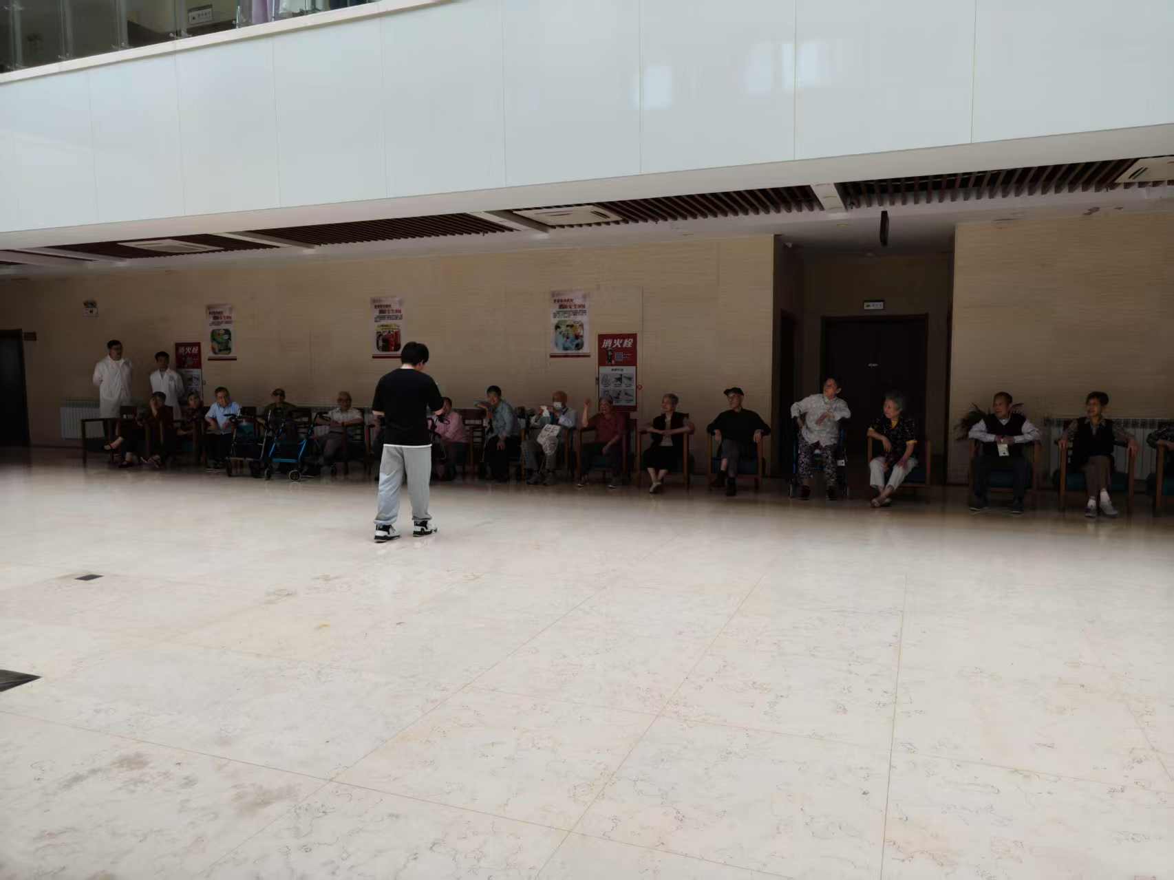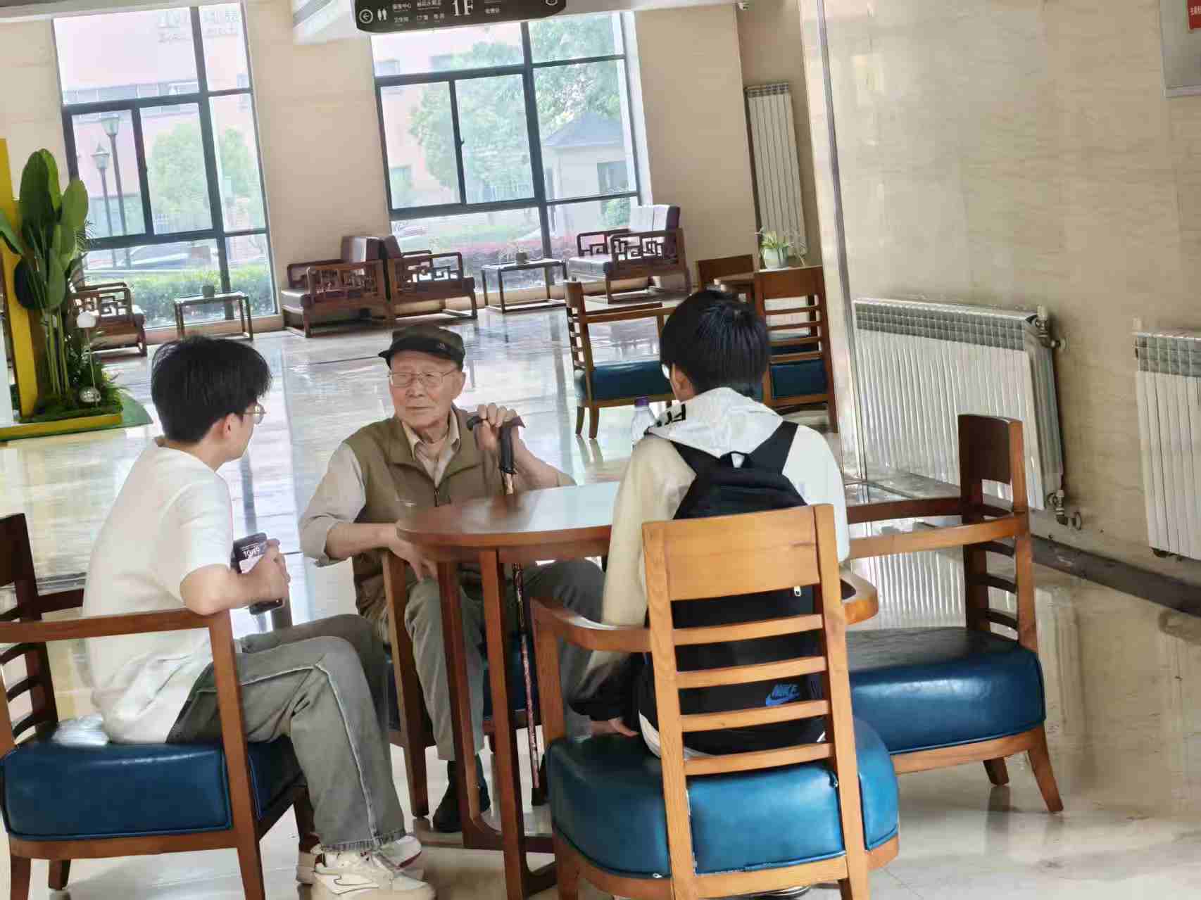 表演結束后,團隊成員和老人們在一樓大廳親切交談,詳細詢問他們的伙食、起居和身體健康狀況,傾聽老人講述他們過去的故事,分享人生的智慧與經驗,現場氛圍溫馨而融洽。