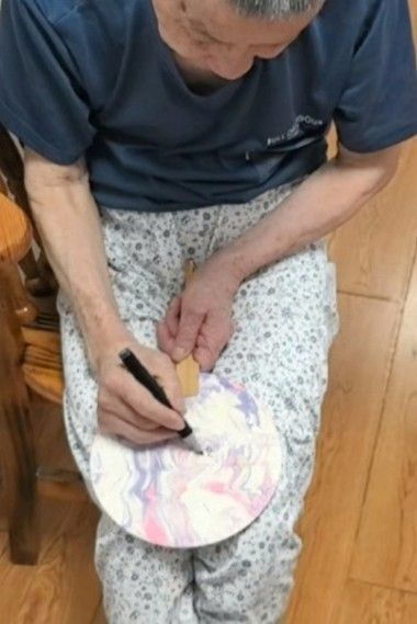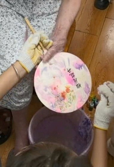 巧手繪漆扇第二天上午的活動現場格外熱鬧。志愿者們發揮專業特長,帶來非遺漆扇制作體驗。不追求完美成果,只享受創作過程——這個理念讓老人們放松地拿起顏料,隨意的滴在水桶里。87歲的陳奶奶做一把帶有荷花配色的扇子,“年輕時最喜歡荷塘的清香”,她笑著說。活動結束后,每把漆扇都被細心標注創作者姓名,拍照留念。