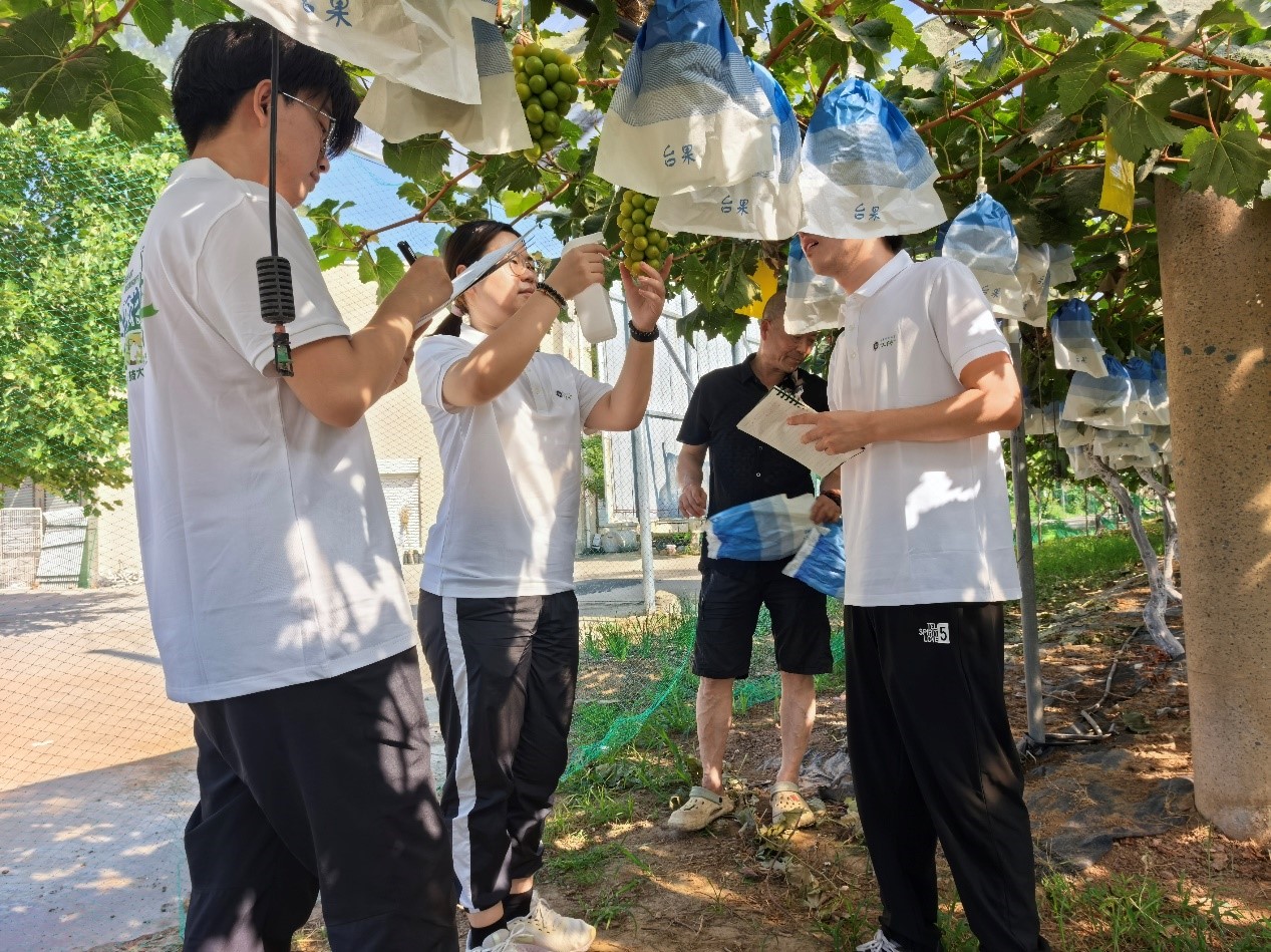 8月7日,“葡先豐”創新創業賽事實踐隊在園區試驗區進行產品測試。隊員向葡萄果穗噴施“葡先豐”試劑,觀察并記錄葡萄果實成熟的全過程,以及處理后果實風味是否發生變化。在整理試驗數據后,確認產品可在保持葡萄原有口感風味的條件下提前成熟,為葡萄早熟生產提供了綠色安全的解決方案。