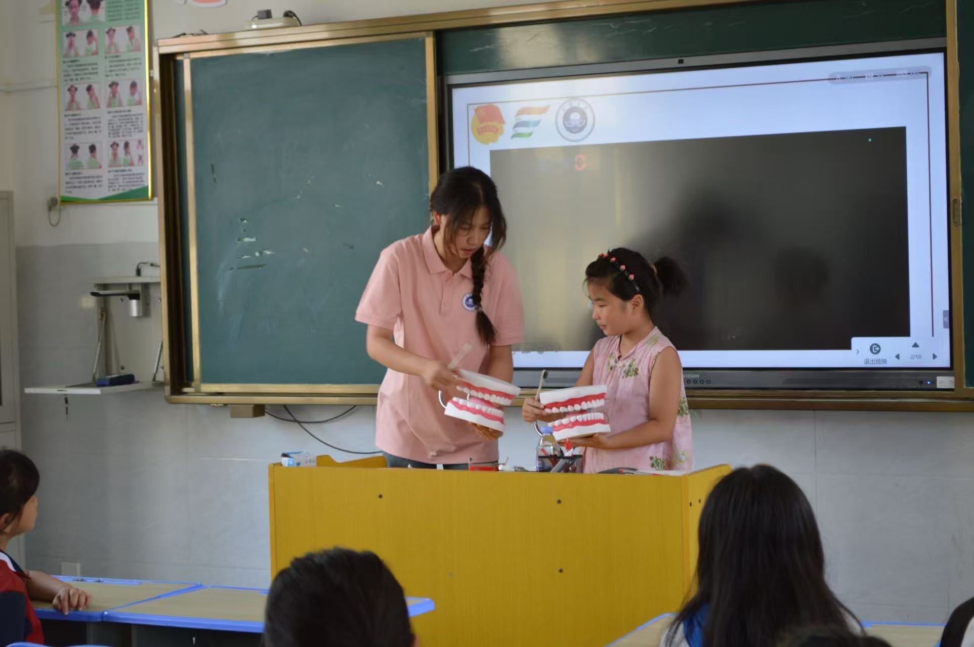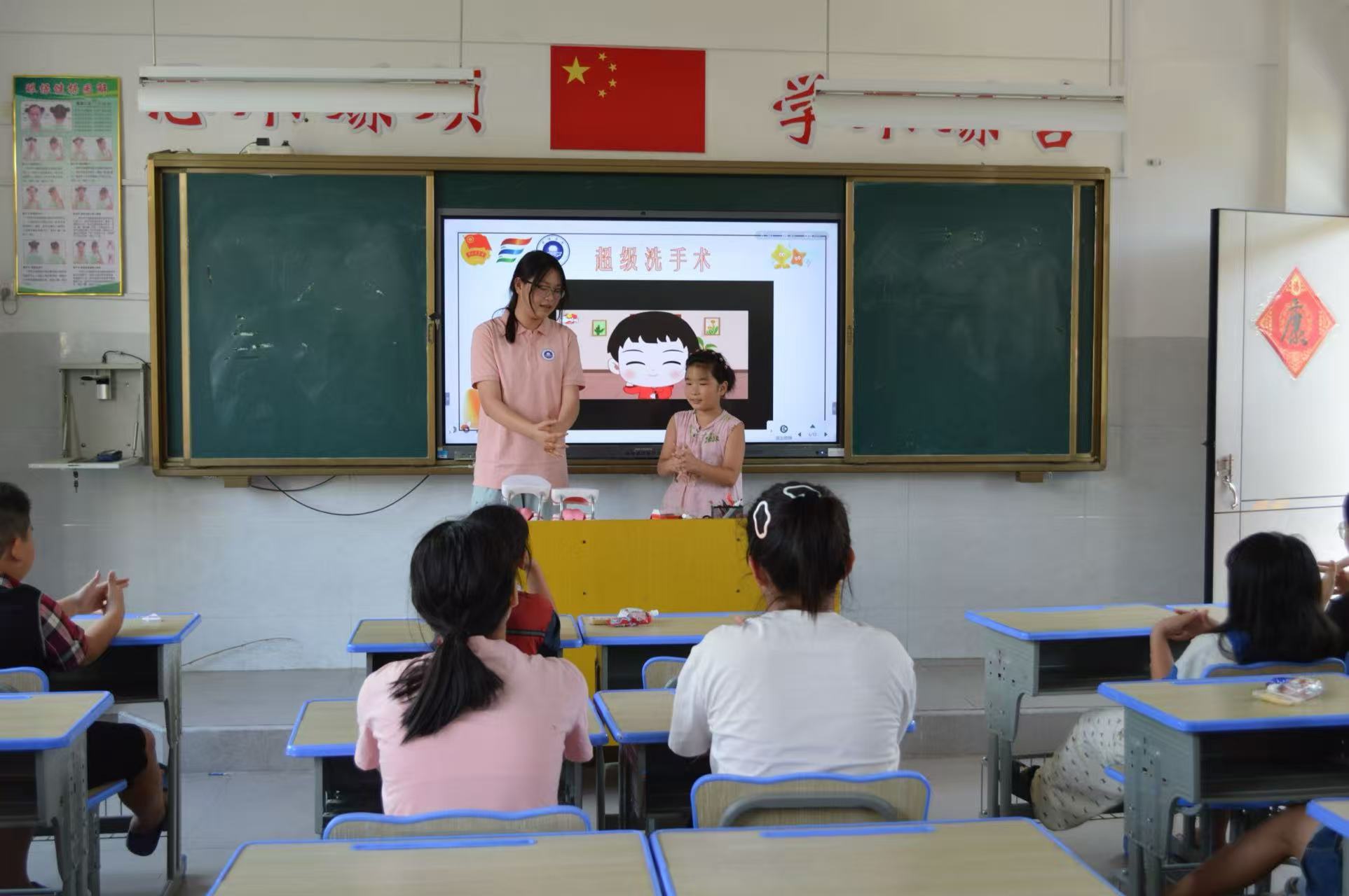 在衛生健康知識教學環節,實踐隊隊員通過生動有趣的示范和講解,向學生們傳授七步洗手法和巴氏刷牙法。隊員們一邊示范標準動作,一邊用通俗易懂的語言講解每個步驟的要點和意義:“掌心相對,手指并攏,相互揉搓,這樣才能把手上的細菌都趕跑。”為了讓學生們更好地掌握,還組織了互動練習,手把手糾正孩子們的動作。學生們紛紛積極參與,認真模仿,現場充滿了歡快的學習氛圍。