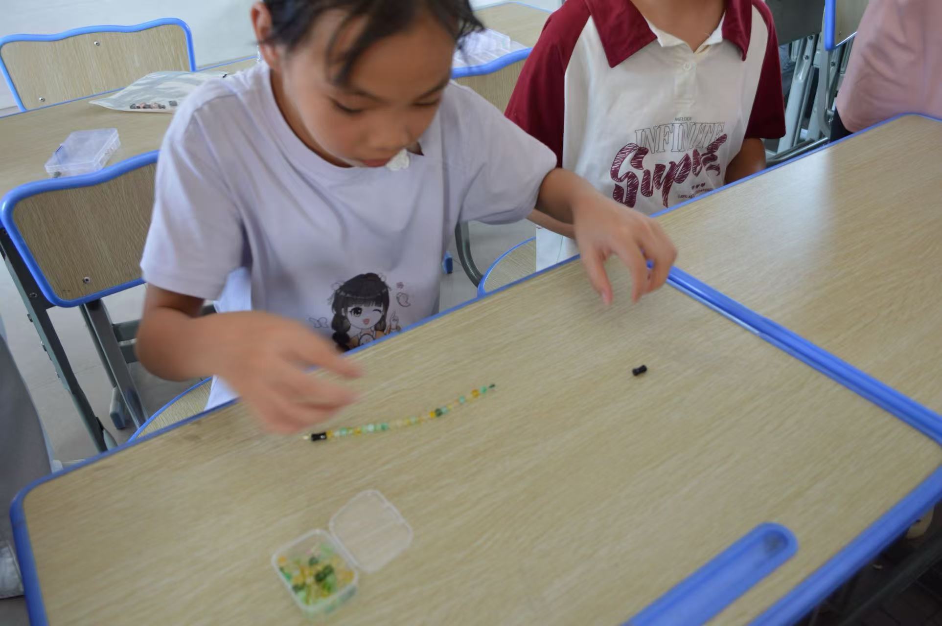 藝術創作課堂上,串珠和扇面繪畫課程深受學生們喜愛。在串珠課上,隊員們準備了五顏六色的珠子和線,指導學生們制作手鏈。孩子們充分發揮想象力,一顆顆珠子在他們手中變成了精美的作品。扇面繪畫課上,隊員們為學生們提供畫筆和空白扇面,鼓勵大家自由創作。有的學生畫下了美麗的校園,有的描繪了心中的夢想,一幅幅充滿童趣的畫作躍然扇上。
