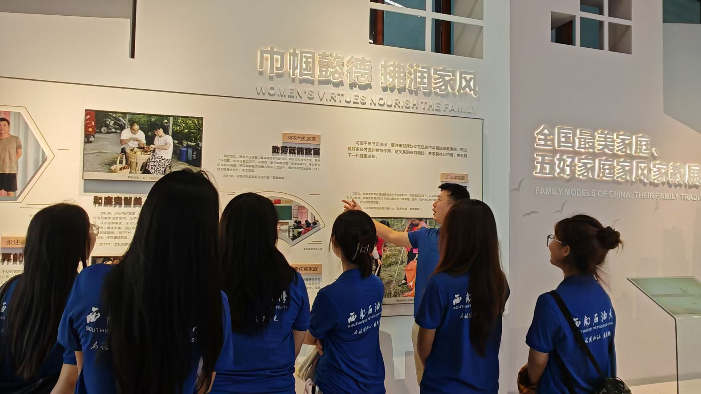當(dāng)日下午,實(shí)踐隊(duì)走進(jìn)天府家風(fēng)館,在“紅色家風(fēng)”“當(dāng)代家教”等展廳中,感悟歷代先賢“修身齊家治國(guó)平天下”的家國(guó)情懷。展廳內(nèi)關(guān)于“巾幗懿德 佛潤(rùn)家風(fēng)”板塊的展區(qū)引發(fā)隊(duì)員熱議,以“堅(jiān)守、奉獻(xiàn)、教育、共治”為核心的家庭故事,與青年返鄉(xiāng)創(chuàng)業(yè)的精神需求、價(jià)值選擇形成深層呼應(yīng)。大家結(jié)合上午調(diào)研的創(chuàng)業(yè)案例,就“如何將個(gè)人理想融入鄉(xiāng)村振興”展開(kāi)討論。隊(duì)員表示:“家風(fēng)館中‘腳踏實(shí)地、敢為人先’的創(chuàng)業(yè)故事,與青年‘把論文寫(xiě)在田野上’的三河村實(shí)踐相互呼應(yīng),讓我們深刻理解到,基層才是青年實(shí)現(xiàn)價(jià)值的廣闊舞臺(tái)。”
