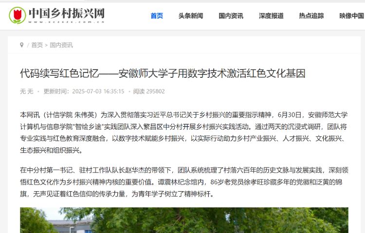 宣傳組的中分村宣傳建設(shè)成效突出,在中國(guó)鄉(xiāng)村振興網(wǎng)的報(bào)道閱讀量突破150000+,中教網(wǎng)、大學(xué)生云報(bào)等平臺(tái)報(bào)道累計(jì)傳播量超2.3萬(wàn)。團(tuán)隊(duì)創(chuàng)作的"6.30紅色足跡紀(jì)實(shí)"等新媒體作品,以年輕化表達(dá)讓紅色故事煥發(fā)時(shí)代魅力。