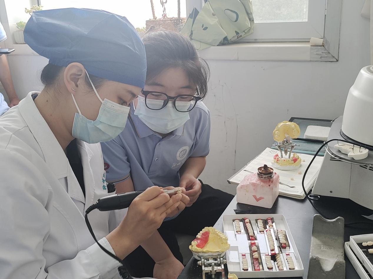 當(dāng)天的實(shí)踐任務(wù)緊鑼密鼓。上午,繼前一日完成牙𬌗的卡環(huán)彎制工作后,緊接著進(jìn)入固定卡環(huán)、磨牙排牙等工作流程。市醫(yī)院專業(yè)醫(yī)師對固定卡環(huán)的精準(zhǔn)定位、基托制作的塑形技巧等過程親身示范,手把手指導(dǎo)同學(xué)們磨牙到排牙的操作要點(diǎn),以及基托塑形的細(xì)節(jié)處理。從工具的規(guī)范握持到操作的先后順序,老師們將經(jīng)驗(yàn)傾囊相授;隊(duì)員們則圍在一旁仔細(xì)觀察、認(rèn)真記錄,隨后在老師的看護(hù)下進(jìn)行實(shí)操,遇到問題及時請教,在反復(fù)調(diào)整中逐漸掌握操作要領(lǐng)。