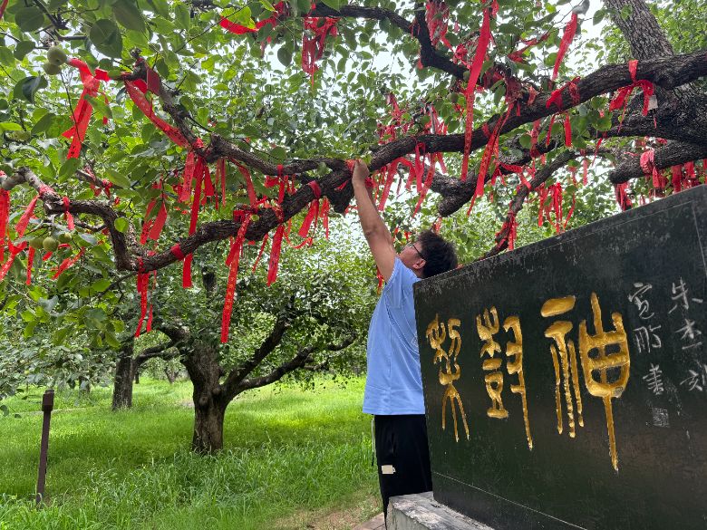 圖為實踐團成員向梨樹神祈福。汪青坪 供圖