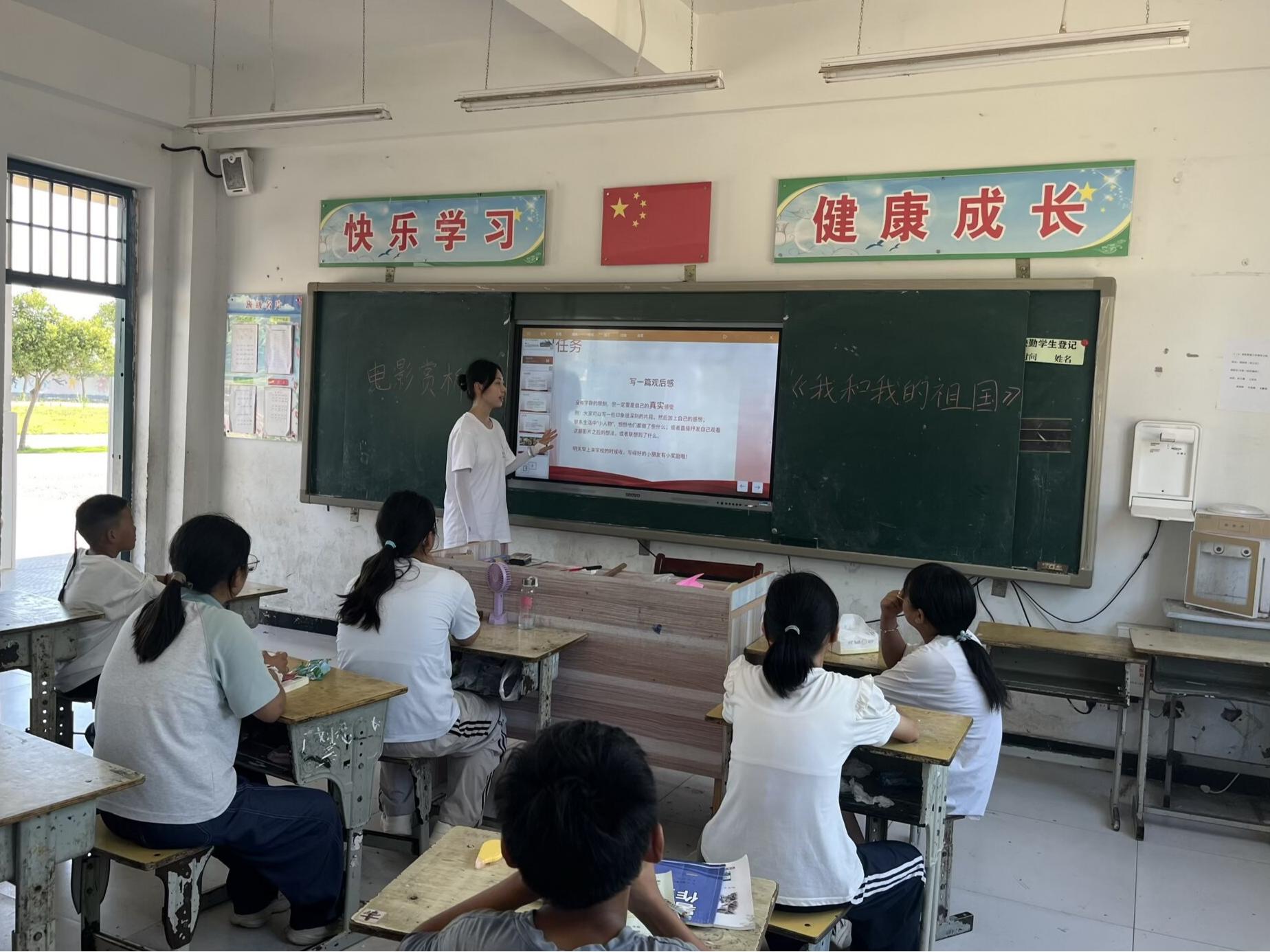 午后 14 時 30 分,愛國主題教育在光影交織中展開。團隊精心選取電影《我和我的祖國》進行展播。銀幕上新中國成立、女排奪冠等歷史片段深深吸引著學生目光。觀影結束后,志愿者通過 PPT 回溯影片中各故事單元的時代背景,深度解析 "原子彈研發"" 香港回歸 " 等事件背后的家國情懷,引導學生從歷史細節中感知個人與國家的命運聯結,將銀幕上的感動轉化為具象化的愛國情感認知。