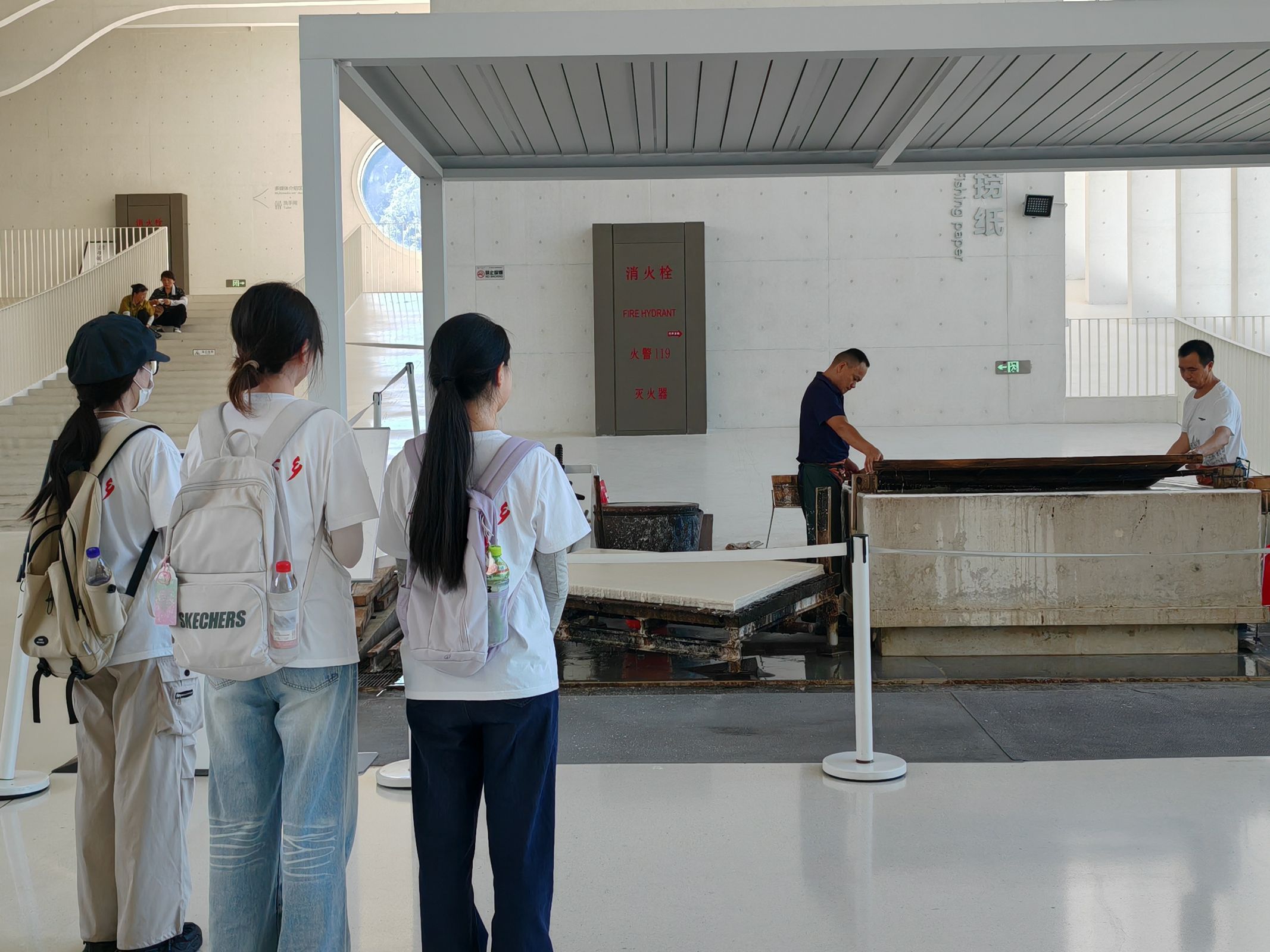 而在古法造紙體驗區(qū),團隊成員們切實的看到匠人們是如何將一張宣紙制成。在“撈紙”技藝展區(qū)時,成員們看到匠人們手持竹簾浸入紙漿池,輕輕晃動、均勻撈起,再經壓水、揭紙等環(huán)節(jié),一張薄如蟬翼的濕紙坯逐漸成形,不禁感嘆宣紙這項非遺文化的魅力與技藝的精細。此外,團隊還參觀了宣紙曬紙的方式。數(shù)張濕紙整齊排列在木架上,陽光透過紙張投射出斑駁光影,匠人手持長桿翻紙、調整角度,確保紙張均勻干燥。