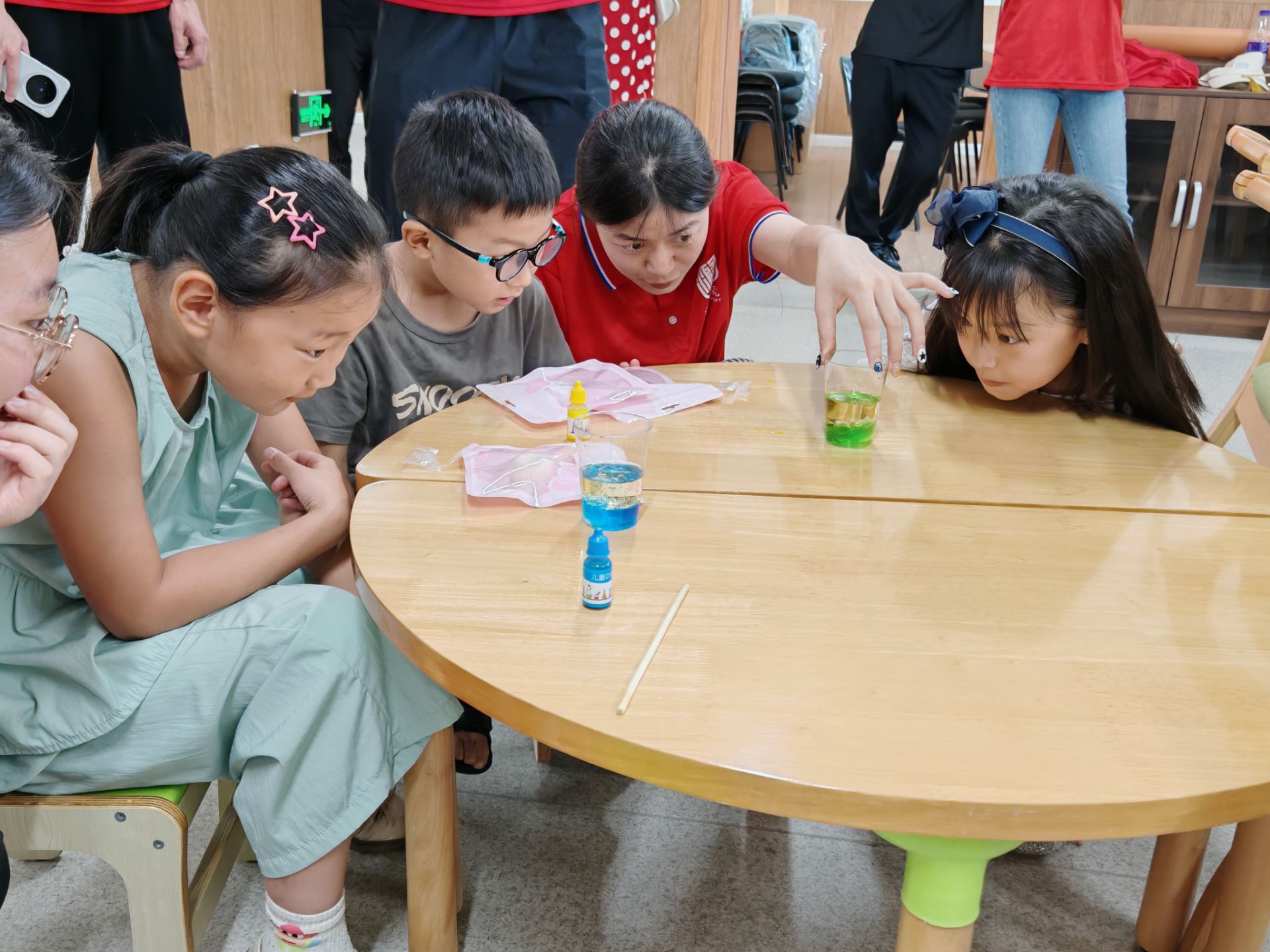 趣味實驗啟航,點燃探索熱情。動手實踐環節無疑是本次活動的亮點之一。為了讓化學知識以更加生動有趣的方式呈現,團隊成員精心策劃了一系列趣味化學小實驗。“海底火山爆發”的壯觀、“特工密信”的神秘、“色素遇上鹽”的奇妙、“水中圓環”的獨特、“神奇的彩虹雨”的絢爛以及“彩虹泡泡龍”的夢幻,每一個實驗都像是一把鑰匙,打開了小朋友們對化學世界好奇的大門。在團隊成員的耐心指導下,小朋友們紛紛化身“小科學家”,親自動手操作,仔細觀察實驗現象,臉上洋溢著對化學神奇魅力的驚嘆與喜悅。此外,團隊還借助視頻講解等形式,進一步拓展科學的魅力邊界,極大地激發了學生們對化學的好奇心和探索欲。