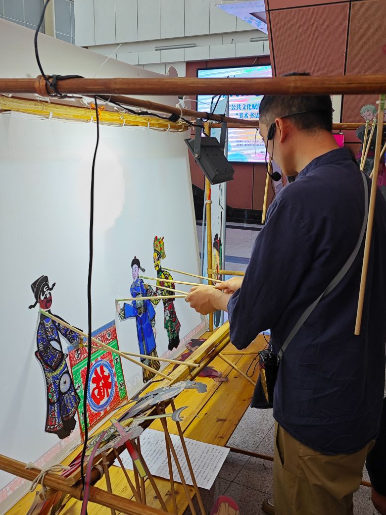 而活動中的一大亮點,當屬湖南省省級非遺傳承人吳淵老師及其團隊帶來的傳統非遺紙影表演。在活動正式開始前,吳淵老師精心準備的互動環節便吸引了眾人的目光。他拿出自己制作的與當代影視角色相關的紙影,與現場的大人小孩進行親切互動。這些貼近生活的角色,瞬間點燃了大家的興趣,尤其是孩子們,紛紛被這些栩栩如生的紙影所吸引。吳淵老師熱情地鼓勵孩子們挑選自己喜歡的角色,來到幕布后面親身體驗,親手操作紙影。孩子們稚嫩的小手在幕布后輕輕擺動,一個個紙影角色仿佛被賦予了生命,在光影交錯間舞動。通過這樣的互動,不僅讓孩子們感受到了動手的樂趣,更讓更多人直觀地了解到湘潭非遺紙影的文化魅力,在孩子們心中播下了非遺傳承的種子。