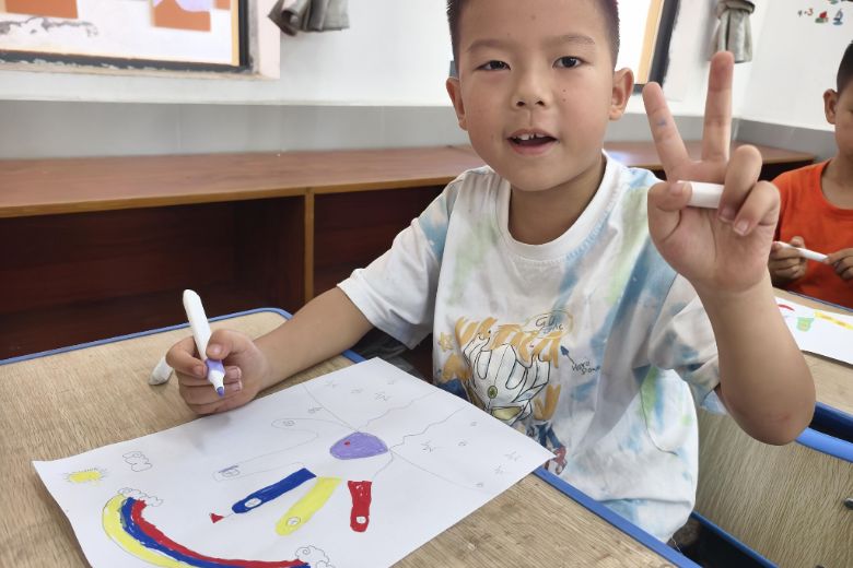 課堂上,小希將自己的手掌輪廓置于一片金黃的麥穗田,手掌上布滿了老繭。稚嫩的筆觸間,流露出對長輩辛勤勞作的敬意。男孩小恩描繪著自己心中的家鄉新貌,村口則是那面永遠鮮艷的紅旗。