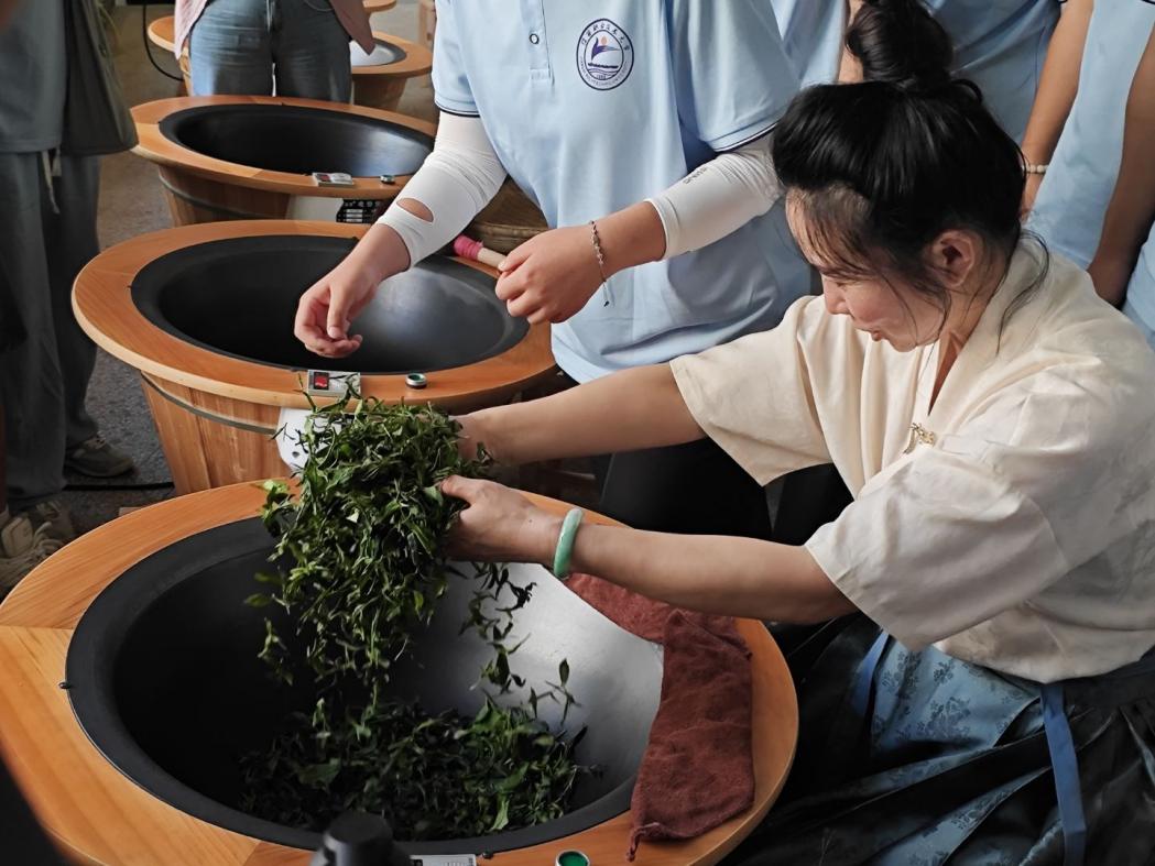 傳承人傾囊授技法,學子躬身探茶秘廬山云霧茶制作技藝傳承人以“廬山生態與茶韻根基”為切入點,結合千年制茶歷史,詳細講解了鮮葉采摘“一芽兩葉”的標準化要求——需選取芽頭飽滿、葉片舒展的嫩梢,既保證原料活性,又契合廬山氣候特征;從萎凋環節的濕度精準調控,到殺青時“高溫快炒”鎖住鮮爽,再到揉捻塑形、理條定形、烘干提香等核心工序,每一步都凝結著古人順應自然、敬畏生態的智慧。實踐隊員們圍爐執鍋,沉浸式參與制茶全流程。“過去以為制茶是‘老把式’的經驗活,現在才明白,從鮮葉選擇到火候控制,每個環節都有嚴格的科學邏輯。”隊員丁同學在實踐手記中寫道,“這份傳承不僅是技藝的延續,更是人與自然和諧共生的生存哲學,我們要讓云霧茶的茶香與文化故事‘走’出深山,讓更多人讀懂其中的智慧。”