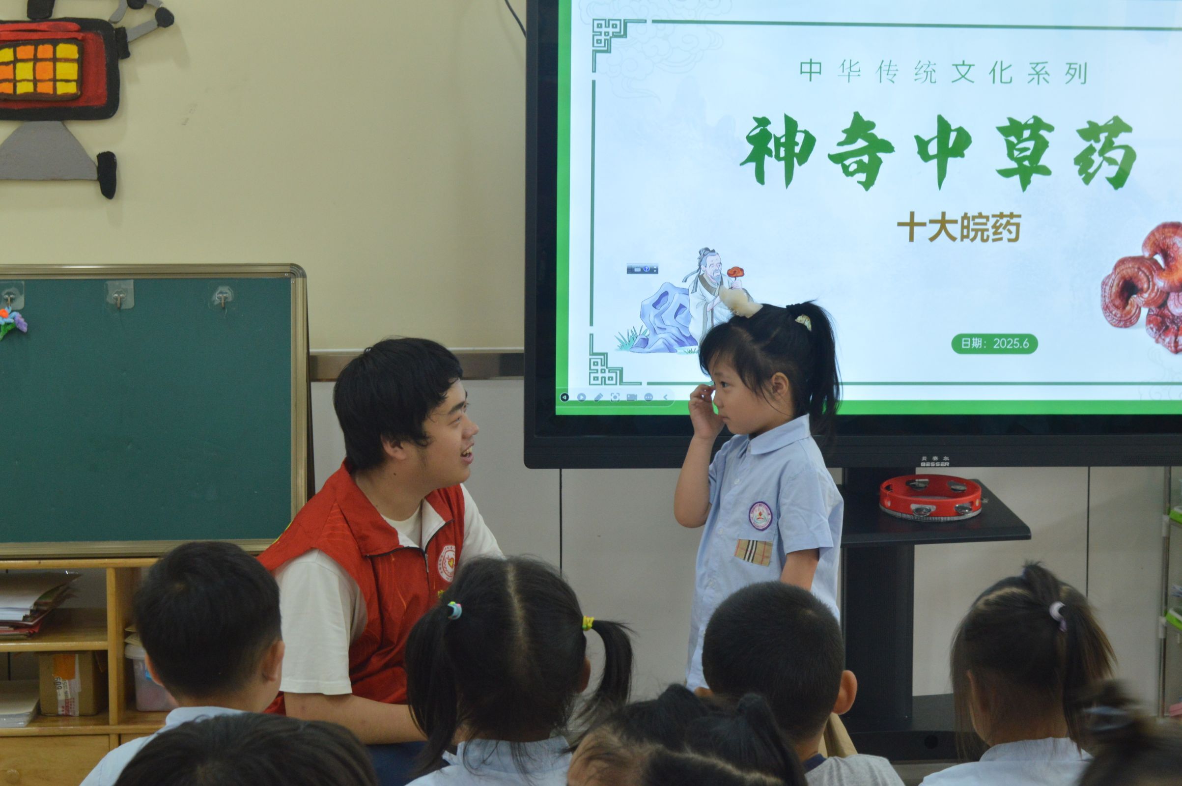 活動現場,團隊成員們化身 “中醫藥小講師”,通過制作精美的 PPT,以生動活潑的語言和色彩鮮艷的圖片,向小朋友們介紹了被譽為 “安徽十大皖藥” 的霍山石斛、亳白芍、銅陵鳳丹、宣木瓜、滁菊、黃山貢菊、茯苓、靈芝、黃精、天麻。“小朋友們,霍山石斛可是生長在高高的懸崖峭壁上,被稱為‘中華九大仙草之首’呢!” 隨著講師們繪聲繪色的講解,孩子們瞪大了好奇的眼睛,不時發出陣陣驚嘆,仿佛已經置身于安徽的青山綠水間,探尋著這些珍貴藥材的蹤跡。