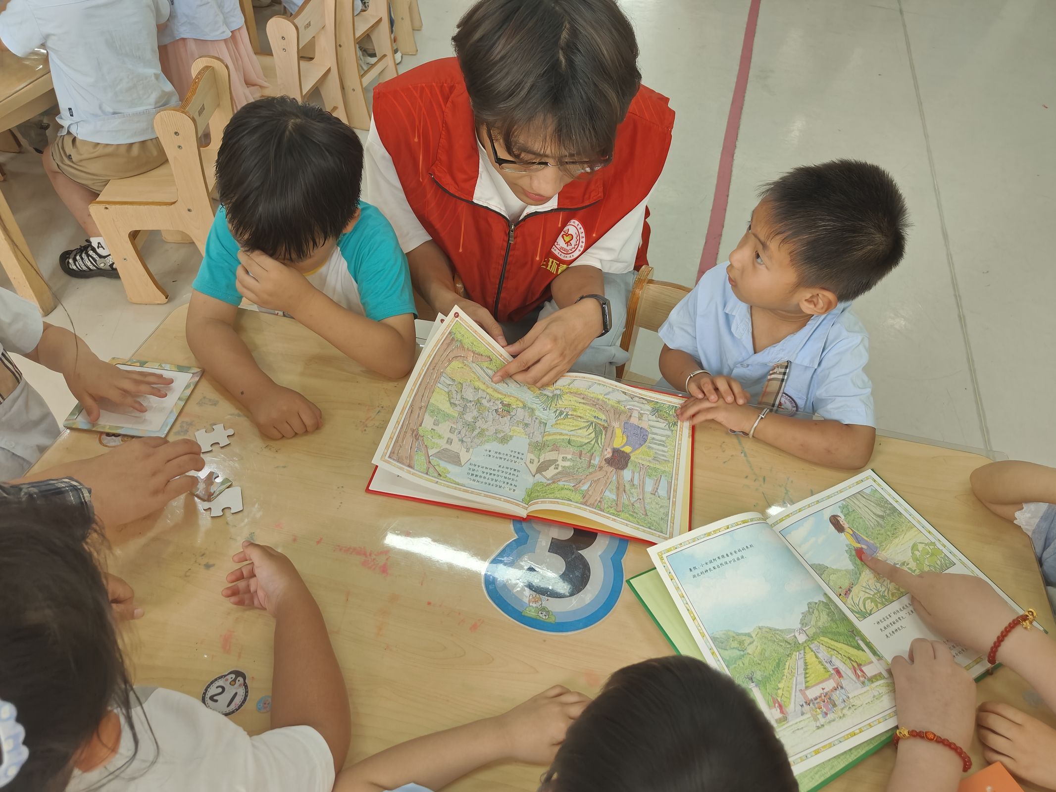 在充滿趣味的中藥小游戲環節,團隊成員精心設計了 “皖藥大闖關” 游戲。活動通過給小朋友分發發箍,進行字卡蹲游戲,在歡樂的游戲氛圍中,孩子們不僅加深了對安徽十大中藥的印象,還鍛煉了觀察力和反應力。 隨后,富有創意的中藥拼圖環節開始。拼圖上印有安徽十大中藥的形態、生長環境以及功效介紹,小朋友們分組合作,你拼一塊、我找一塊,在動手實踐中進一步認識了這些來自家鄉的中藥材。同時,團隊成員還為孩子們發放了定制的中醫藥趣味讀物,書中以簡單易懂的故事和精美的插畫,講述了安徽中藥的小知識,鼓勵孩子們在課后繼續探索中醫藥的奧秘。活動最后,最受期待的制作香囊環節登場。團隊成員準備了艾葉、藿香、佩蘭等中藥材,以及印有安徽特色風景的香囊袋。孩子們在志愿者的指導下,小心翼翼地將藥材碾碎、混合,裝入香囊。不一會兒,一個個散發著清新藥香、承載著安徽文化特色的香囊就制作完成了。“我要把這個香囊掛在書包上,這樣我就能每天聞到香香的中藥味啦!” 孩子們拿著自己親手制作的香囊,臉上洋溢著自豪與喜悅。