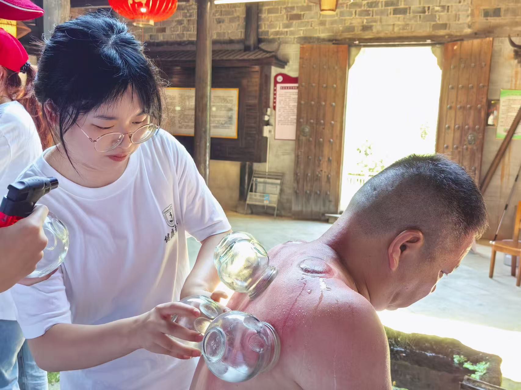 在拔罐區(qū),經驗豐富的老師沉穩(wěn)有序。玻璃罐在酒精棉的火焰中輕快一閃,旋即穩(wěn)穩(wěn)吸附于村民的背脊。隨著罐內負壓形成,局部肌膚微微隆起,淤滯的氣血仿佛在這一刻被悄然喚醒、重新流動。村民活動,著腰背,驚喜之情溢于言表。學子們仔細觀察著罐印顏色變化,據(jù)此分析體質狀況,并向村民娓娓道來拔罐祛除體內濕寒瘀滯、激發(fā)臟腑活力的古老智慧。罐起罐落間,這源自東方的獨特療法以其直觀的效果,贏得聲聲贊嘆。