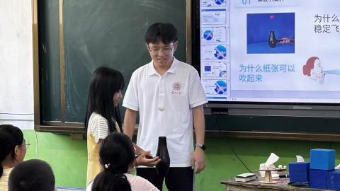 “大家知道為什么乒乓球會浮在空中嗎?”實踐團成員趁機向孩子們提問。孩子們紛紛搖頭,“這是因為吹風機吹出的氣流在乒乓球周圍形成了一個低壓區,而乒乓球上方的空氣壓強相對較大,這樣就產生了一個向上的力,使得乒乓球能夠懸浮在空中。”通過實踐團成員通俗易懂的講解和生動有趣的繪圖,枯燥的伯努利方程漸漸活過來,化作可觸可感的生命體。重力是大地溫柔的牽絆,推力如少年奔跑的決心,阻力恰似成長必經的逆風。孩子們不僅直觀地感受到了空氣動力學的神奇魅力,也對飛行原理產生了濃厚的興趣。他們紛紛表示,想要親手制作飛機模型,進一步探索航空的奧秘。