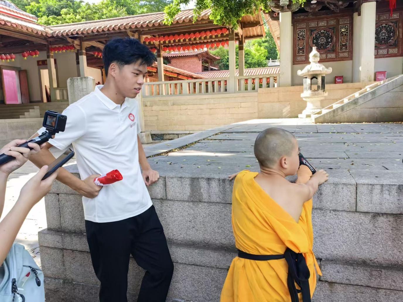 觀看、學習完泉州非物質文化遺產館中有關五祖拳的文物資料后,實踐隊員們走進南少林寺,繼續探究閩臺體育文化,解碼五祖拳中的兩岸情緣,推動兩岸體育文化交流發展。南少林武術源遠流長,可追溯到東晉甚至更早,至今有1300多年歷史,其中以南少林武術拳系中的五祖拳最具代表性,是福建省七大拳種中歷史最悠久、傳播地域最廣泛的拳種。實踐隊員通過觀看與五祖拳有關的演出,深刻體會到五祖拳的剛勁有力。俗話說,“臺上一分鐘,臺下十年功。”精彩演出的背后是無數個日夜的努力拼搏、不斷嘗試。通過與演出人員的溝通交流,了解到此次演出的“演員”為平均年齡七八歲的小男孩,他們大概四五歲時就被家長送過來學習武術幾乎所有時間都花在南少林寺,每天進行武術練習。