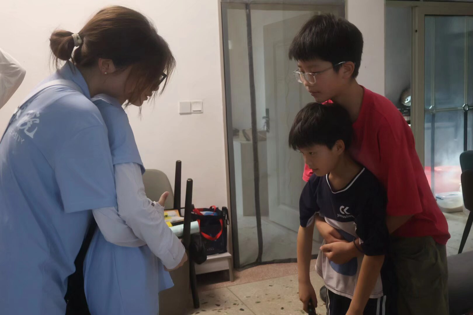針對夏季高發的健康問題,上午,團隊成員分組走進村民家中,重點講解熱射病、中暑、溺水及有害蟲類叮咬的預防和應急處理措施。 熱射病與中暑:志愿者用當地方言詳細解釋兩者區別,強調“早期降溫、及時補水”的原則,并演示用濕毛巾冷敷、服用藿香正氣液等實用方法。 溺水救援:通過案例提醒村民“不盲目下水施救”,傳授用竹竿、繩索間接救援的技巧。 蛇蟲叮咬:發放自制的“防蟲急救包”,演示被蛇、蜜蜂等叮、咬后如何清洗傷口、壓迫包扎。 “夏天干農活容易中暑,今天學到用涼水沖手腕降溫,簡單又管用!”村民連連點贊。