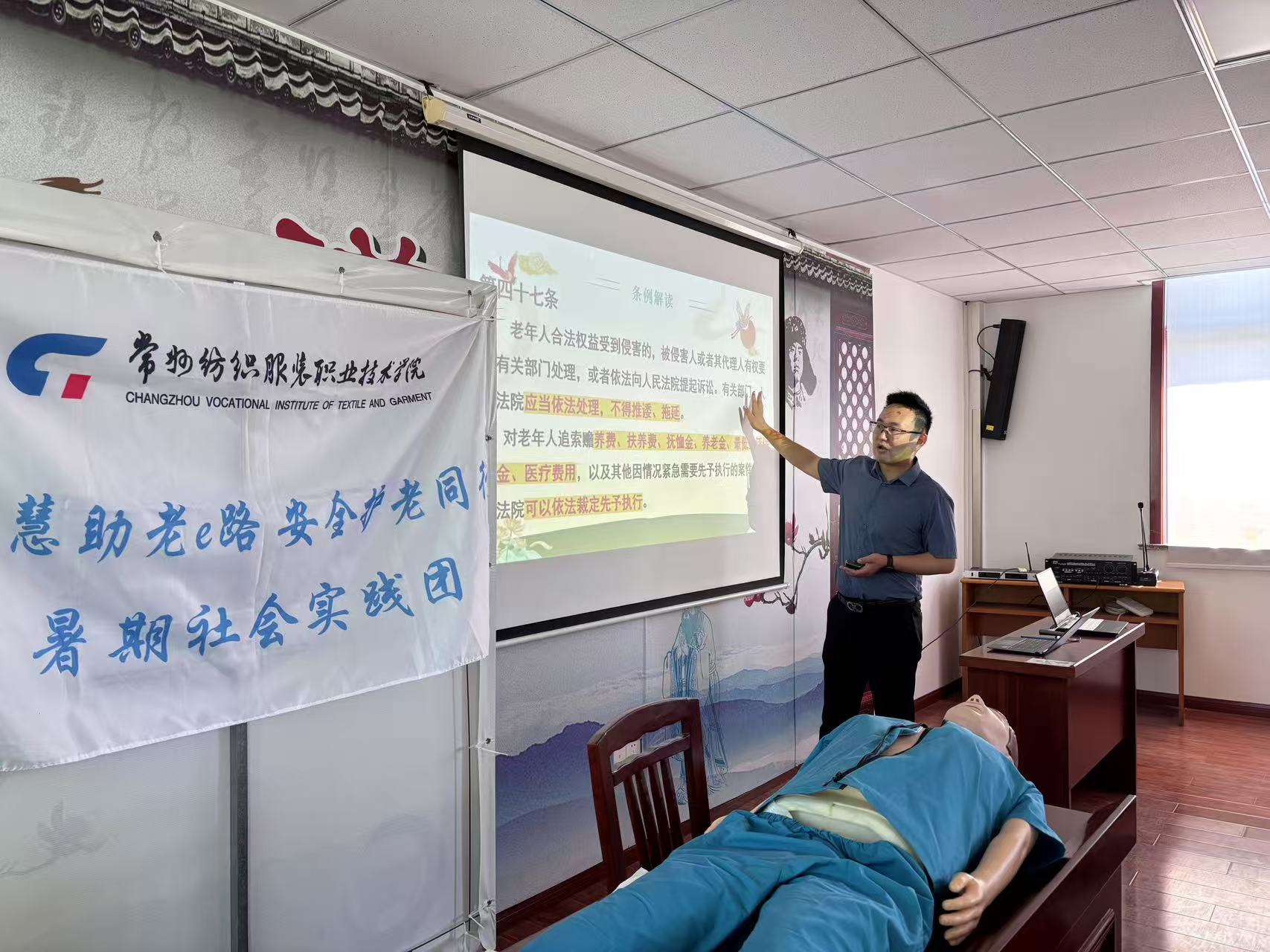 活動期間,實踐團圍繞急救、法律兩大核心,開展知識宣講。在急救知識宣講環節,志愿者們運用AED器材,詳細演示操作方法與人工呼吸流程,手把手教學,讓老年人學會基本應急救護技能,增強緊急狀況下自救互救能力。法律宣講板塊,指導老師俞旭帶來普法課堂,結合老年人群體易遇法律問題,如權益維護、財產保障等,用通俗案例講解法律知識,還開設現場咨詢,為老年人解疑答惑,助力搭建社區與法律顧問長效合作橋梁。