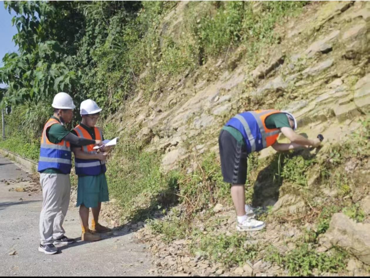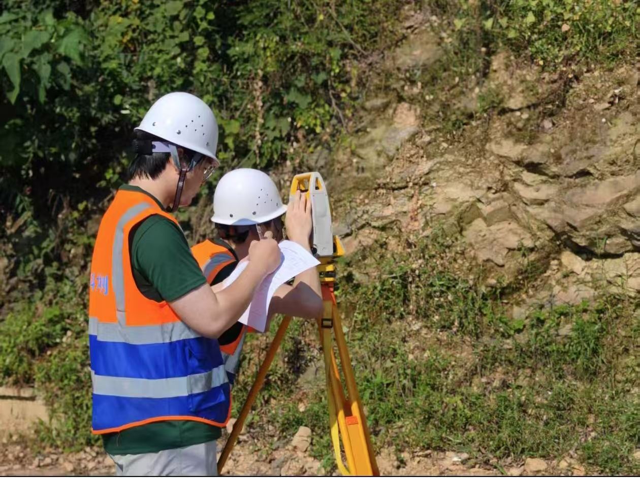 抵達(dá)爐竹村后,團(tuán)隊迅速投入緊張有序的工作。他們攜帶了地質(zhì)探測儀、無人機(jī)、全站儀、測距儀等一系列先進(jìn)專業(yè)設(shè)備,這些裝備如同他們的“秘密武器”,為精準(zhǔn)探測地質(zhì)隱患提供了有力支撐。在帶隊導(dǎo)師的現(xiàn)場指揮下,團(tuán)隊成員有條不紊地對當(dāng)?shù)氐幕聟^(qū)域展開細(xì)致勘查,仔細(xì)分析邊坡巖體的傾向與傾角,不放過任何一個可能影響邊坡穩(wěn)定性的細(xì)節(jié);利用皮尺,認(rèn)真丈量邊坡的高度、長度等關(guān)鍵數(shù)據(jù),為后續(xù)的分析提供基礎(chǔ)依據(jù);操作全站儀對邊坡進(jìn)行三維坐標(biāo)測量,通過高精度的測繪數(shù)據(jù)構(gòu)建出邊坡的精確形態(tài)模型,從而對邊坡穩(wěn)定性進(jìn)行科學(xué)評估,并運用專業(yè)軟件對拍攝數(shù)據(jù)進(jìn)行深入分析,進(jìn)一步挖掘潛在的地質(zhì)隱患。