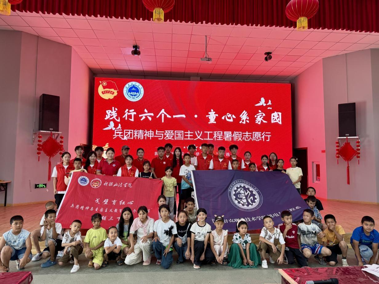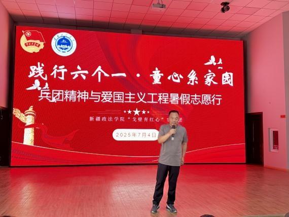 2025年7月4日上午,新疆政法學院“戈壁育紅心”愛國主義教育實踐團與第三師四十四團十一連的天福社區攜手,開啟了“六個一工程”的“三下鄉”社會實踐活動。首先進行了開班儀式,天福社區黨支部書記對此次活動表示了高度認可,他深入闡釋活動主旨,強調在戈壁熱土傳承“熱愛祖國、無私奉獻、艱苦創業、開拓進取”的兵團精神對鑄牢中華民族共同體意識的時代意義,并熱情呼吁社區青少年踴躍參與,感召大家在體驗中汲取精神養分。
