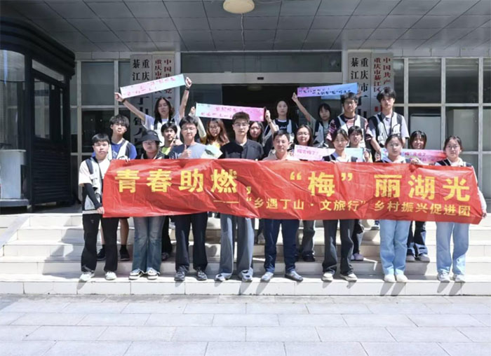 2025年7月6日,重慶移通學院“鄉遇丁山·文旅行”鄉村振興促進團在重慶市綦江區丁山鎮開啟新一輪實踐工作。通過前期的走訪與實地調研后,促進團開啟了“青春助燃,‘梅’麗湖光”直播帶貨教學的首秀,并且在丁山鎮人民政府進行初步成果匯報,以創意與實踐共繪鄉村振興的青春圖景。