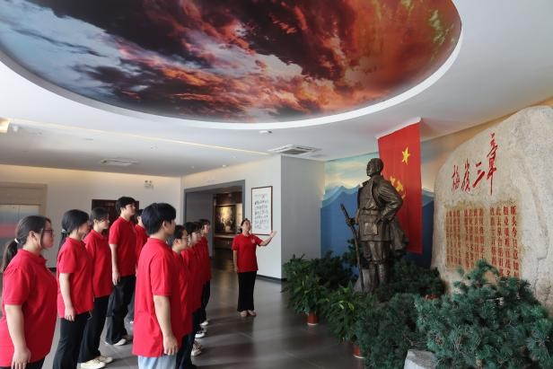 實踐隊走進梅嶺三章紀(jì)念館。館外,“堅定信念、百折不撓、艱苦奮斗”三面大旗震撼人心。館內(nèi),《梅嶺三章》手稿真跡在玻璃展柜中泛著溫潤的光澤。“這詩不是寫在紙上,而是刻在戰(zhàn)士的骨頭上、群眾的口碑里。”隊員們駐足凝視,有的用手機記錄展柜里的文物,有的輕聲交流“南國烽煙正十年”的歷史背景。紅軍戰(zhàn)士靠野菜充饑,用樹皮裹傷,卻始終高唱《國際歌》。“原來‘艱苦卓絕’四個字,背后是這樣的血肉之軀。”實踐隊員紅了眼眶,“今天的幸福,是先輩用命換的,我們更要挺膺擔(dān)當(dāng)。”