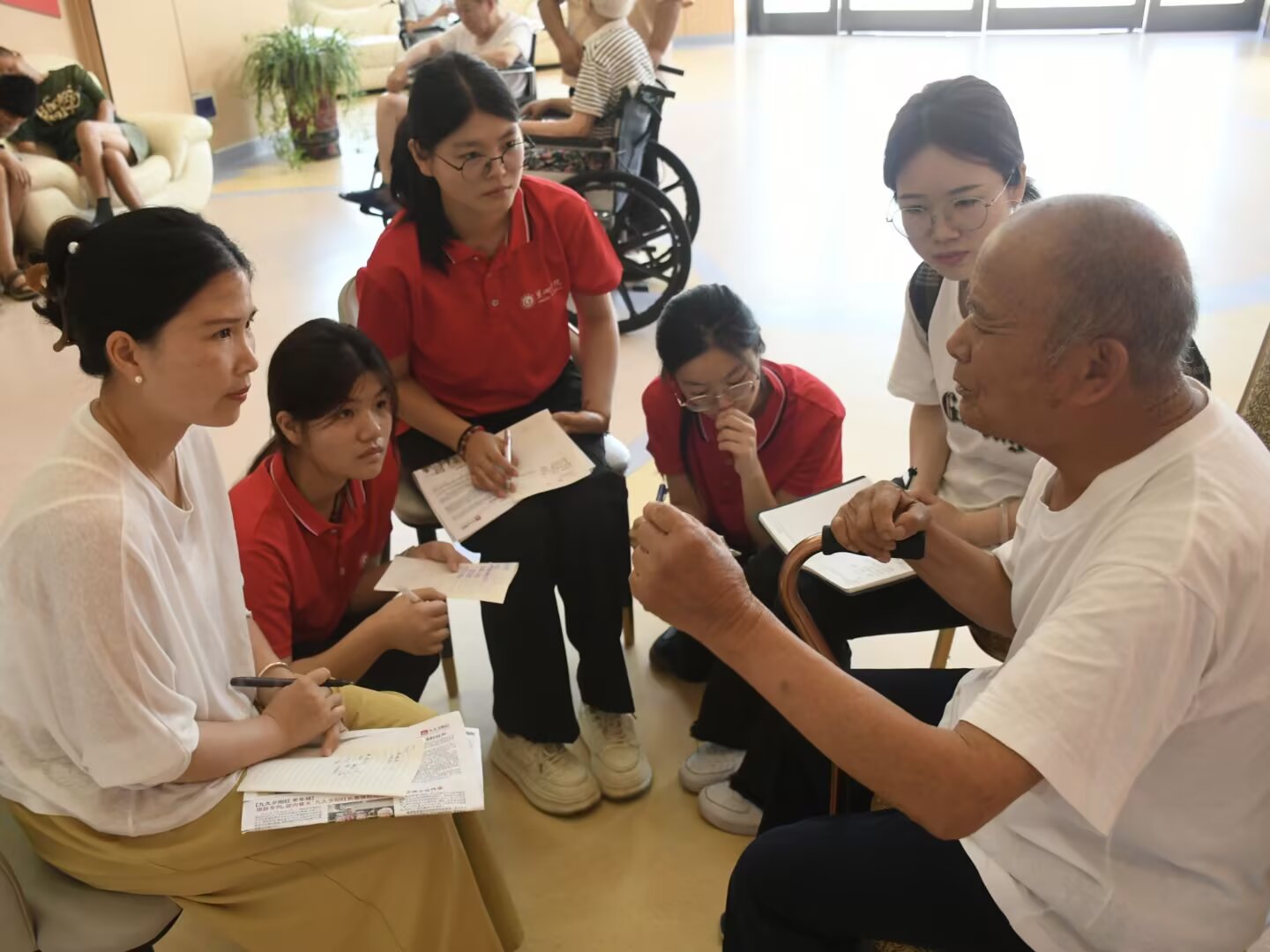 隊員們通過傾聽老黨員的經歷,感悟頗多,其中黨員李鴛鴦表示他們身上能夠明顯的感受到偉大往往藏在平凡里,他們沒有驚天動地的事跡,只有"黨需要就去干"的樸素信念。正是千千萬萬這樣默默奉獻的普通人,用一生的堅守鑄就了今天的中國。采訪結束后,隊員們推老人們下樓看電視,引導老人開展套圈、投壺等娛樂活動、陪伴老人聊天,通過志愿行動踐行“尊老敬老”的中華傳統美德。