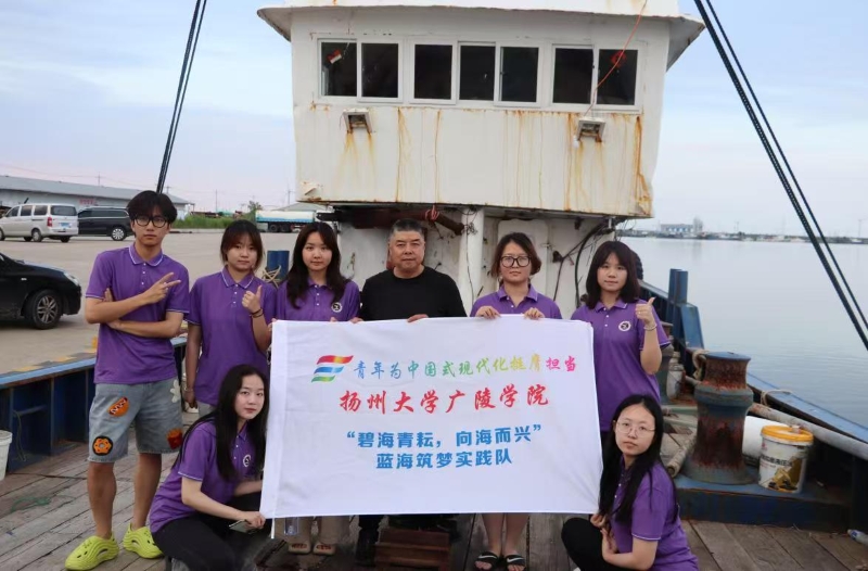 (圖為7月7日“碧海青耘,向海而興”實(shí)踐隊(duì)成員與漁民張叔在劉埠漁港的生產(chǎn)船上合影留念。周承達(dá)供圖)
